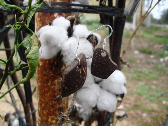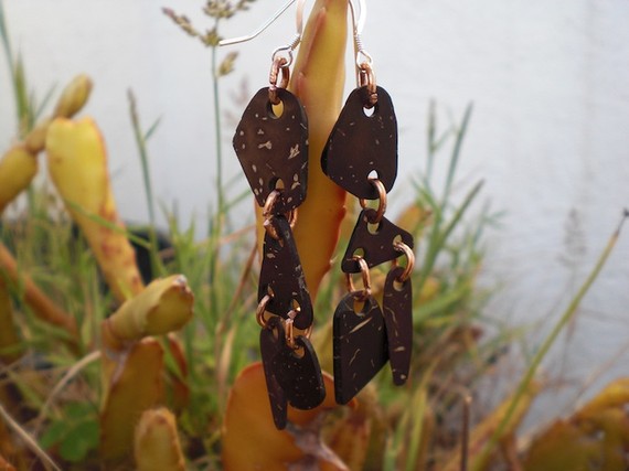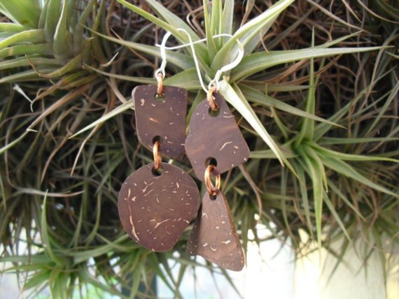 These handmade earrings were made out of natural coconut shell (jump rings are copper and ear hooks are sterling silver). Copper used on jump rings is recycled from old computer components.