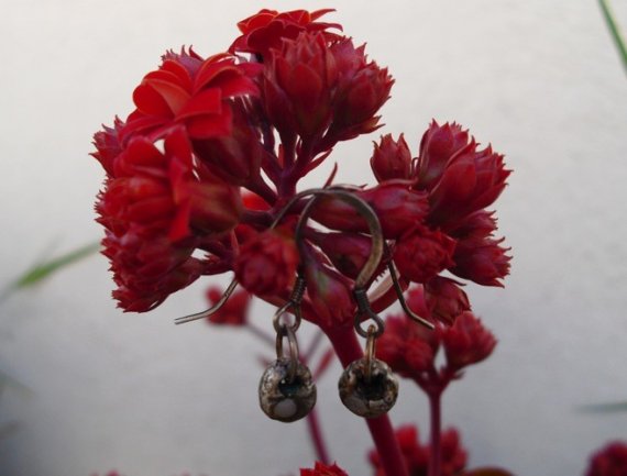 These handmade earrings were created with pure silver (also known as fine silver) oxidized with liver of sulphur (ear hooks and jump rings are sterling silver).