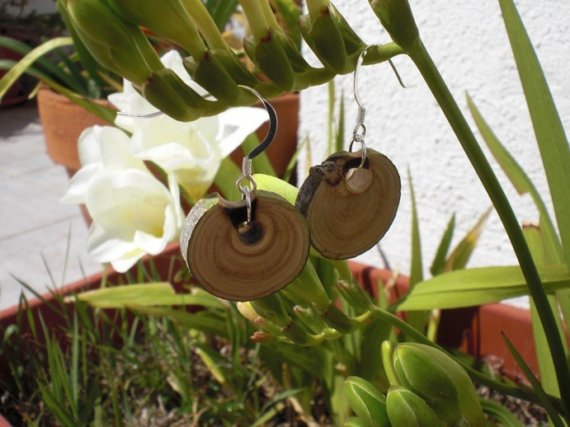 These handmade earrings were created with natural olive tree (Olea europea) wood, Arbequina variety, grown here on the Mediterranean coast (ear hooks and jump rings are sterling silver).